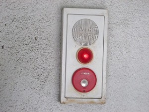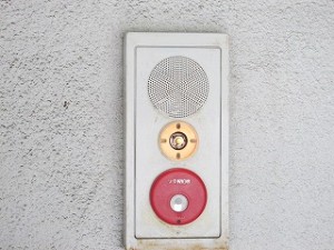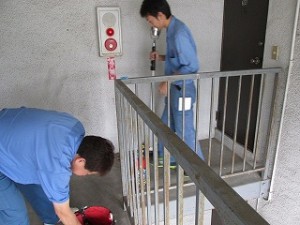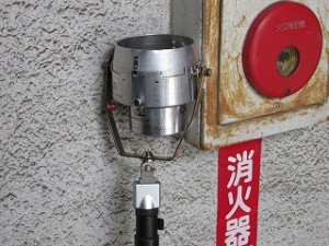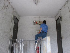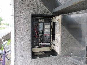 防災点検の方が普段触ってはいけなそうな箱を開け操作しています。